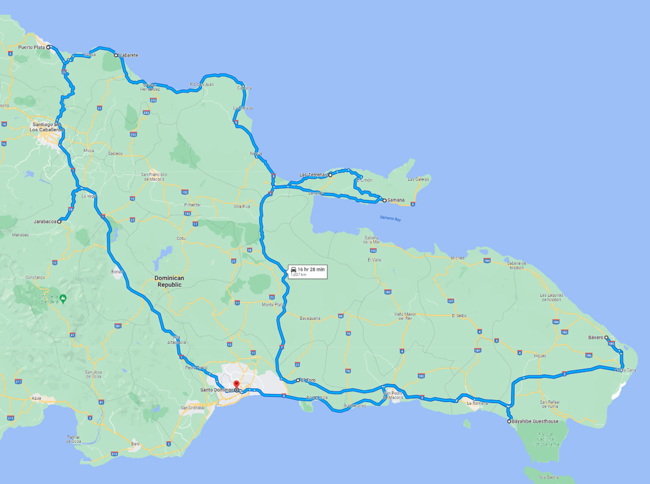 Route taken as shown on map, starting from Santo Domingo driving north towards Cabarete then east to Las Terrenas, Punta Cana and finally to Bayahibe. And flying back from Santo Domingo Airport.